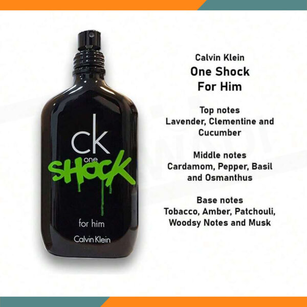 CK One Shock For Him by Calvin Klein is a Oriental Spicy fragrance for men. CK One Shock For Him was launched in 2011. CK One Shock For Him was created by Ann Gottlieb and IFF. Top notes are Lavender, Clementine and Cucumber; middle notes are Cardamom, Pepper, Basil and Osmanthus; base notes are Tobacco, Amber, Patchouli, Woodsy Notes and Musk.
