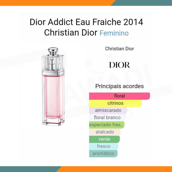 Dior Addict Eau Fraiche 2014 by Dior is a Floral fragrance for women. Dior Addict Eau Fraiche 2014 was launched in 2014. Top notes are Calabrian bergamot and Grapefruit; middle notes are Freesia and Lily-of-the-Valley; base notes are White Musk and Woodsy Notes.