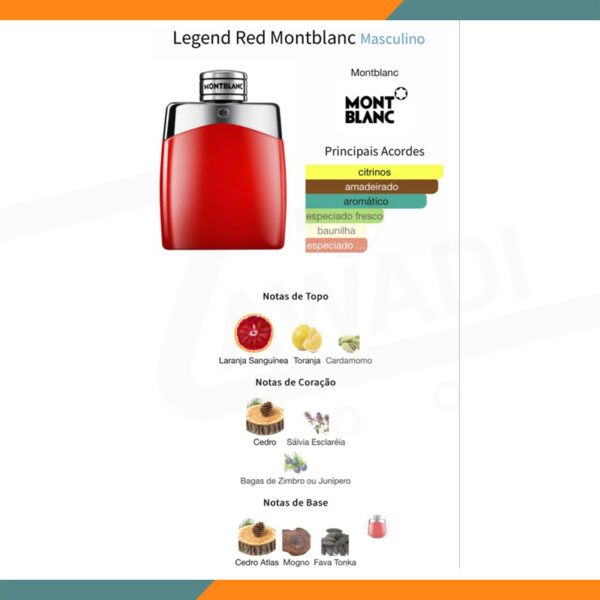 Legend Red by Montblanc is a fragrance for men. This is a new fragrance. Legend Red was launched in 2022. Top notes are Blood Orange, Grapefruit and Cardamom; middle notes are Cedar, Clary Sage and Juniper Berries; base notes are Atlas Cedar, Mahogany and Tonka Bean.